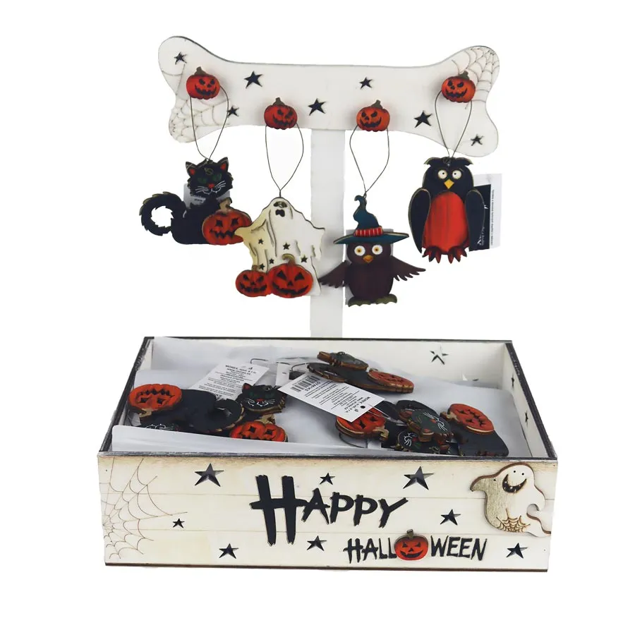 Box halloweenskych dekorácií na zavesenie. Box obsahuje 72 dekorácií, 4 druhy dekorácií.