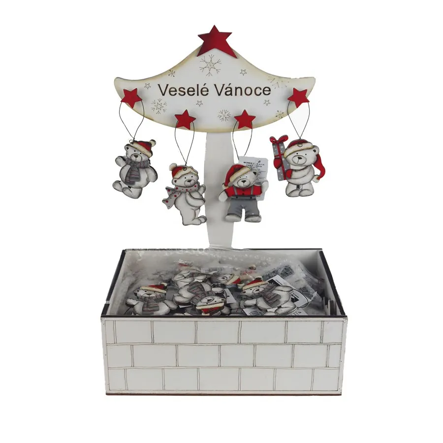 Drevené ozdoby na stromček v boxe. Box obsahuje 72 medvedíkov, 4 druhy medvedíkov.