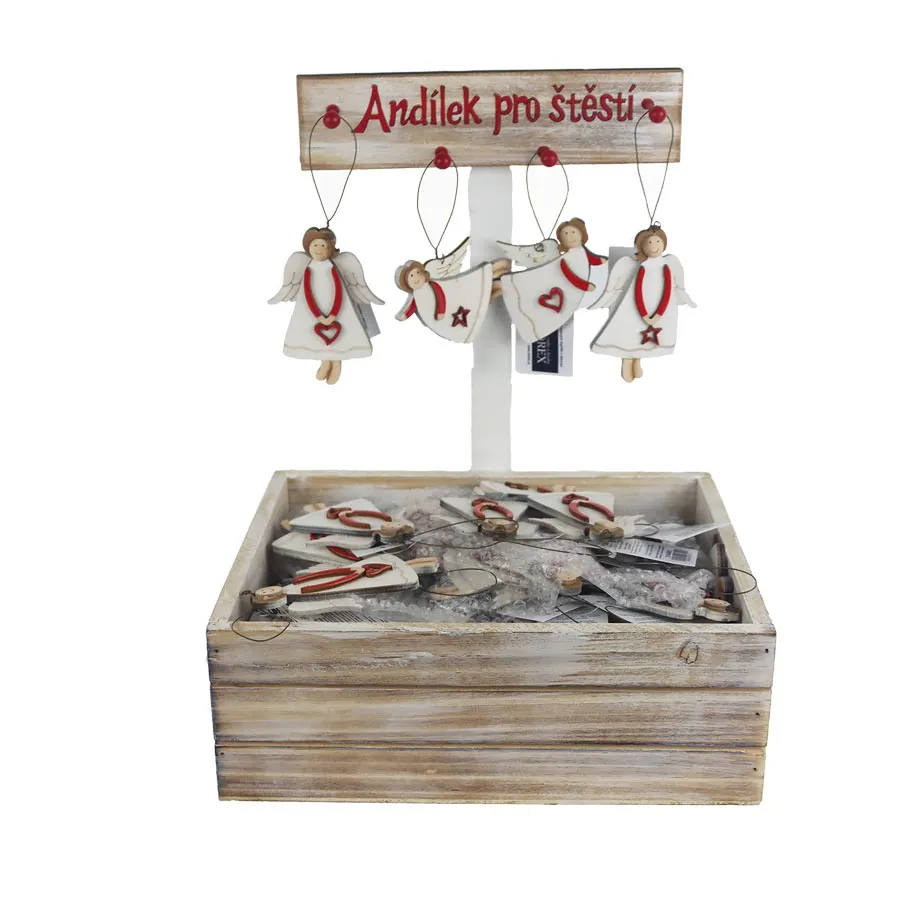 Drevení anjeli na stromček v boxe. Box obsahuje 72 anjelikov, 4 druhy anjelikov.