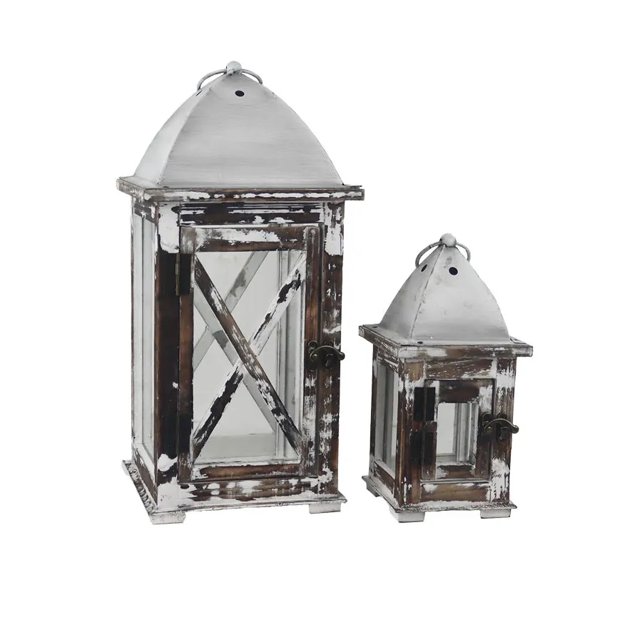 Sada drevených lampášov. Sada obsahuje 2 lucerny o dvoch veľkostiach. Malý lampáš má rozmery: 12 x 12 cm, výšku 23,5 cm. Veľká lampáš má rozmery: 18,5 x 18,5 cm, výšku 40 cm. Vneste do svojho domova či záhrady kúzlo orientálneho štýlu. Tieto lucerny sú vyrobené z dreva a sklenených panelov, horná časť je z kovu. Lucerny majú praktickú rukoväť, ktorá vám uľahčí ich prenášanie medzi domom a záhradou.