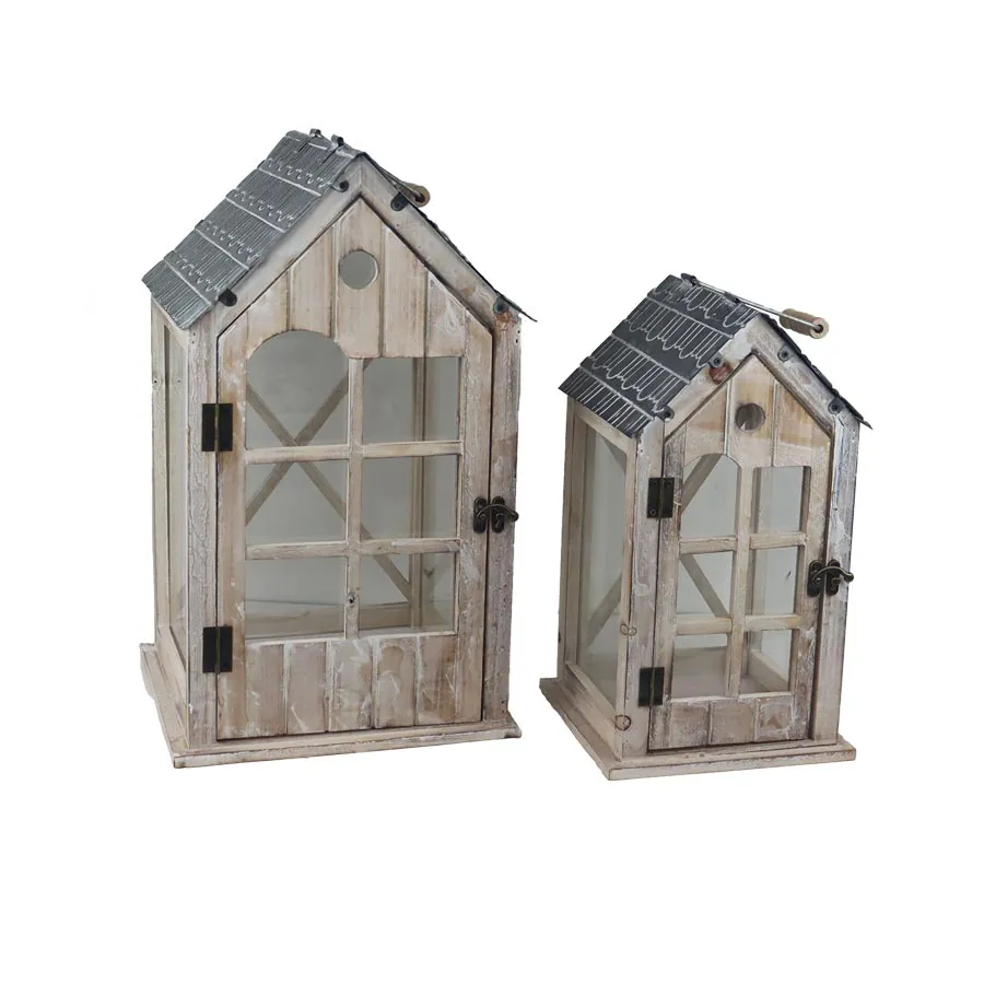 Sada drevených lampášov. Sada obsahuje 2 lucerny o dvoch veľkostiach. Malý lampáš má rozmery: 18 x 18,5 cm, výšku 34 cm, celkovú výšku s uchom 42 cm. Veľká lampáš má rozmery: 25 x 25,5 cm, výšku 44 cm, celkovú výšku s uchom 53 cm. Vneste do svojho domova či záhrady kúzlo orientálneho štýlu. Tieto lucerny sú vyrobené z dreva a sklenených panelov, horná časť je z kovu. Lucerny majú praktickú rukoväť, ktorá vám uľahčí ich prenášanie medzi domom a záhradou.