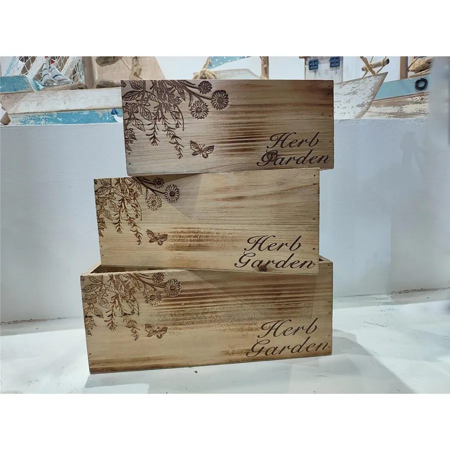 Súprava drevených obalov s plastom. Sada obsahuje 3 obaly s tromi veľkosťami. Malý obal má rozmery: 21 × 11,5 cm, výšku 8,8 cm. Stredný obal má rozmery: 24 × 14.5 cm, výšku 10 cm. Veľký obal má rozmery: 27 × 17,5 cm, výšku 11 cm.