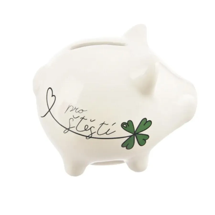 Biela keramická pokladnička v tvare prasiatka s nápisom „Pre šťastie“.