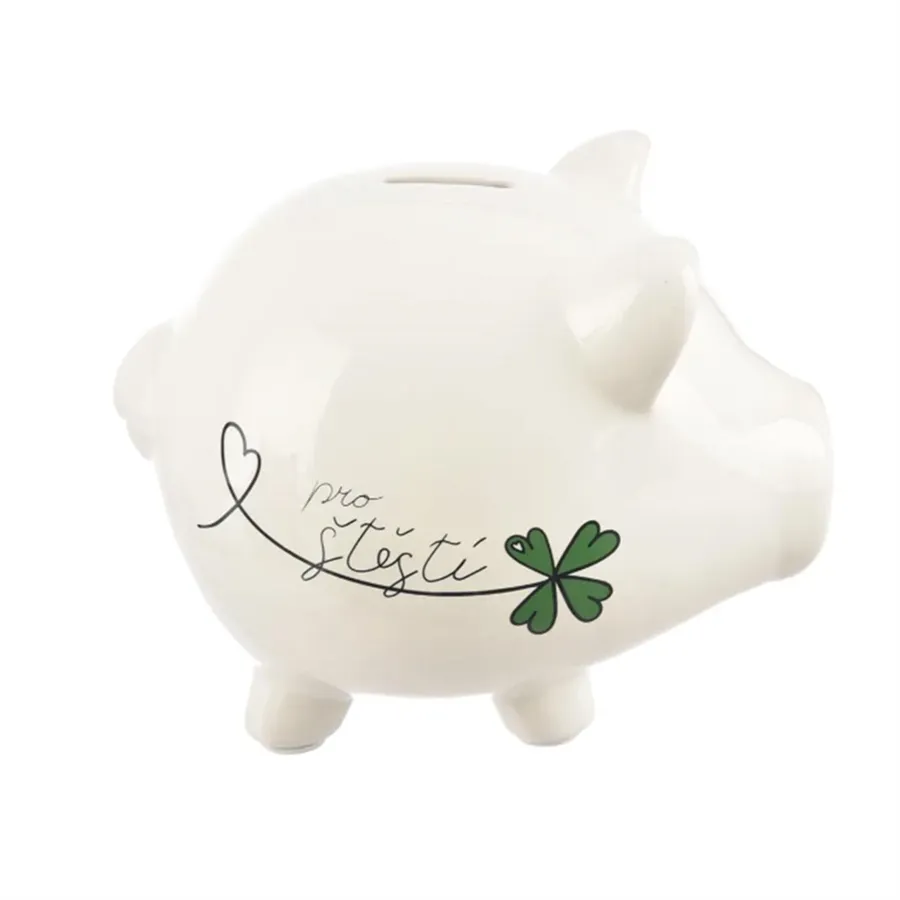 Biela keramická pokladnička v tvare prasiatka s nápisom „Pre šťastie“.