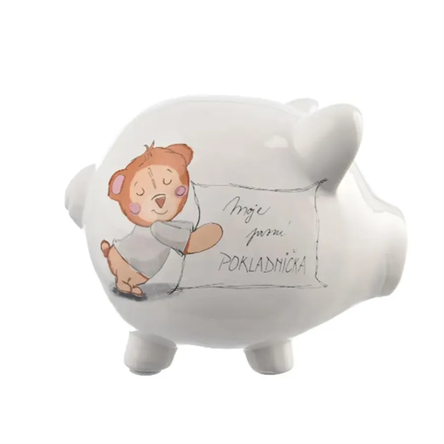 Biela keramická pokladnička v tvare prasiatka s nápisom „Moja prvá pokladnička“.