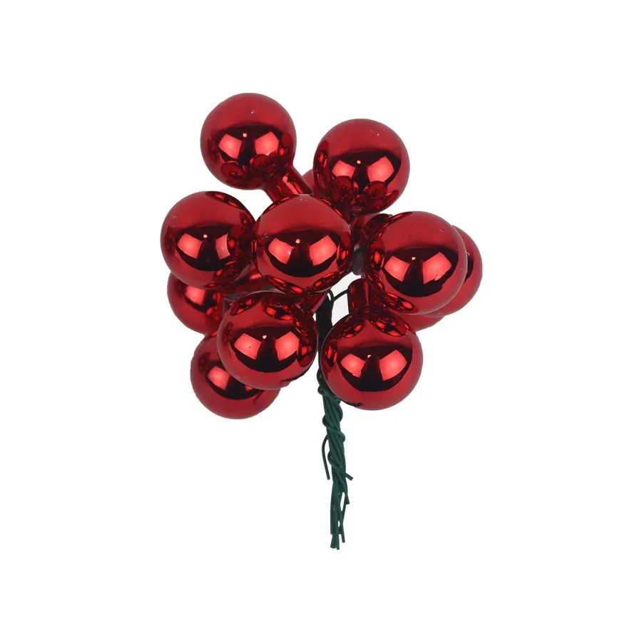Sklenené banky na drôtiku, červená lesklá. Zväzok obsahuje 12 ks.