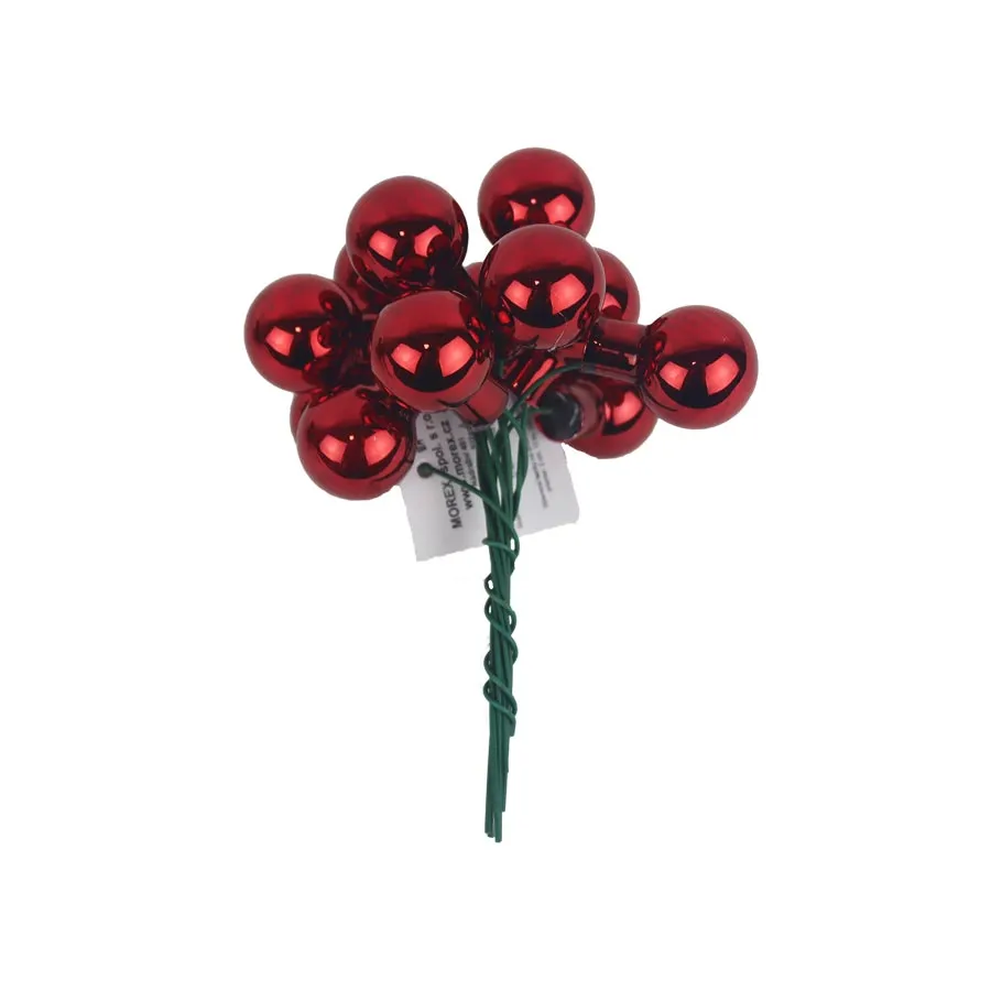 Sklenené banky na drôtiku, červená lesklá. Zväzok obsahuje 12 ks.