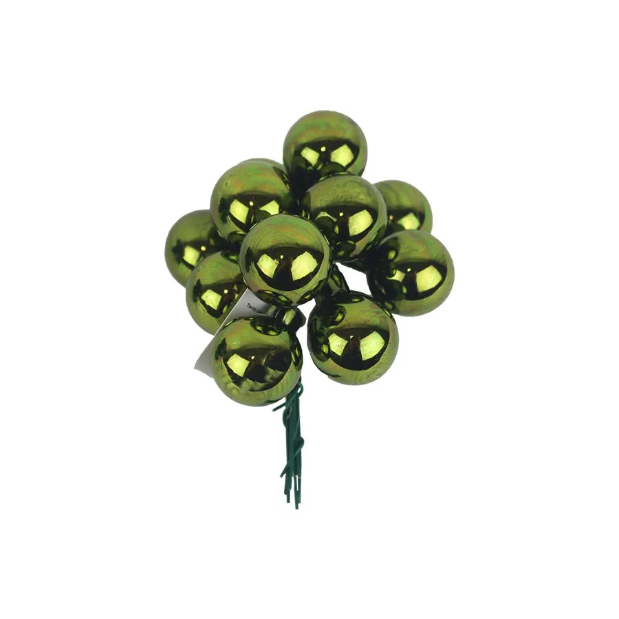 Sklenené banky na drôtiku, tmavo zelená lesklá. Zväzok obsahuje 12 ks.