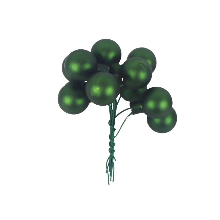 Sklenené banky na drôtiku, tmavo zelená matná. Zväzok obsahuje 12 ks.