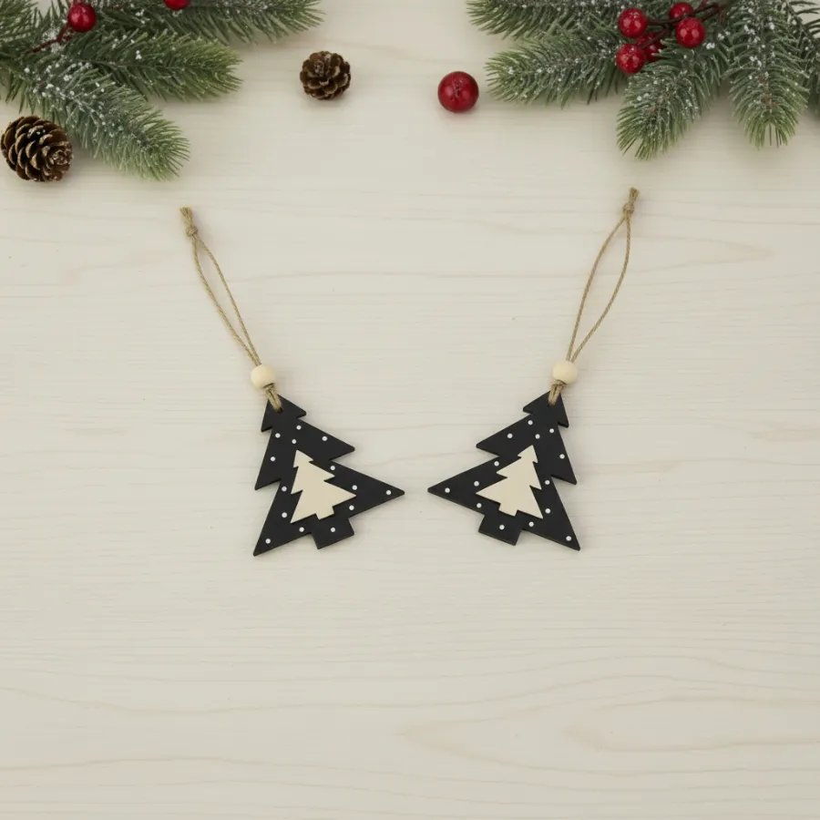 Sada dekoračných stromčekov na zavesenie. Sada obsahuje 2 stromčeky. Farba: kombinácia čierna s bielou. Materiál: na báze dreva. Rozmery: 7,5 x 0,5 x 8 cm.