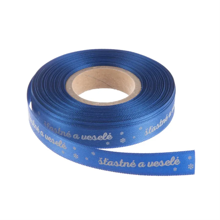 Modrá polyesterová stuha s potlačou "šťastné a veselé" je ideálna na balenie vianočných darčekov alebo ozdobenie vianočných dekorácií.