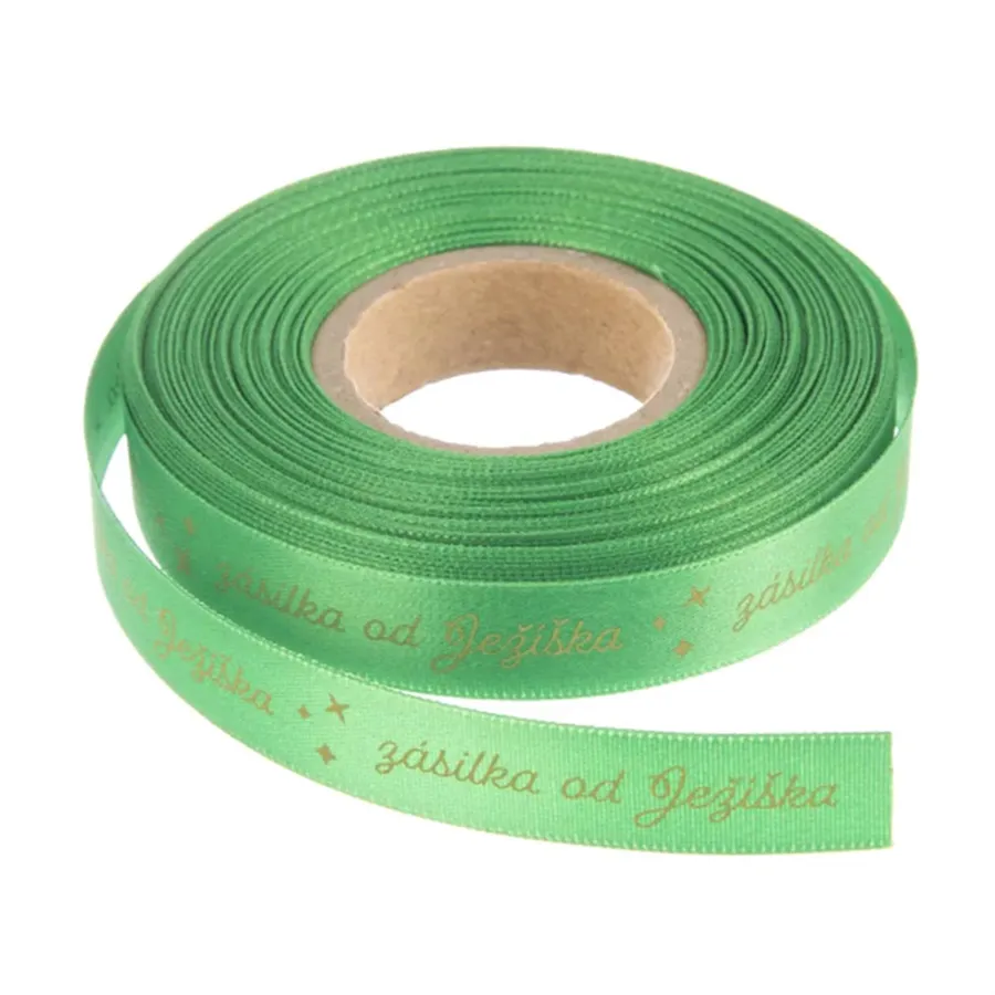Zelená polyesterová stuha s potlačou "zásielka od Ježiška" je ideálna na balenie vianočných darčekov alebo ozdobenie vianočných dekorácií.