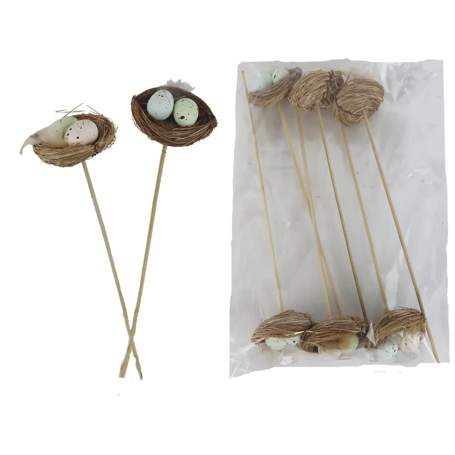 Sada dekoračných zápichov hniezdo s vajíčkami. Sada obsahuje 6 zápichov. Zápich má rozmery: priemer 6,5 cm, výška 3 cm, celková dĺžka zápichu 26 cm.
