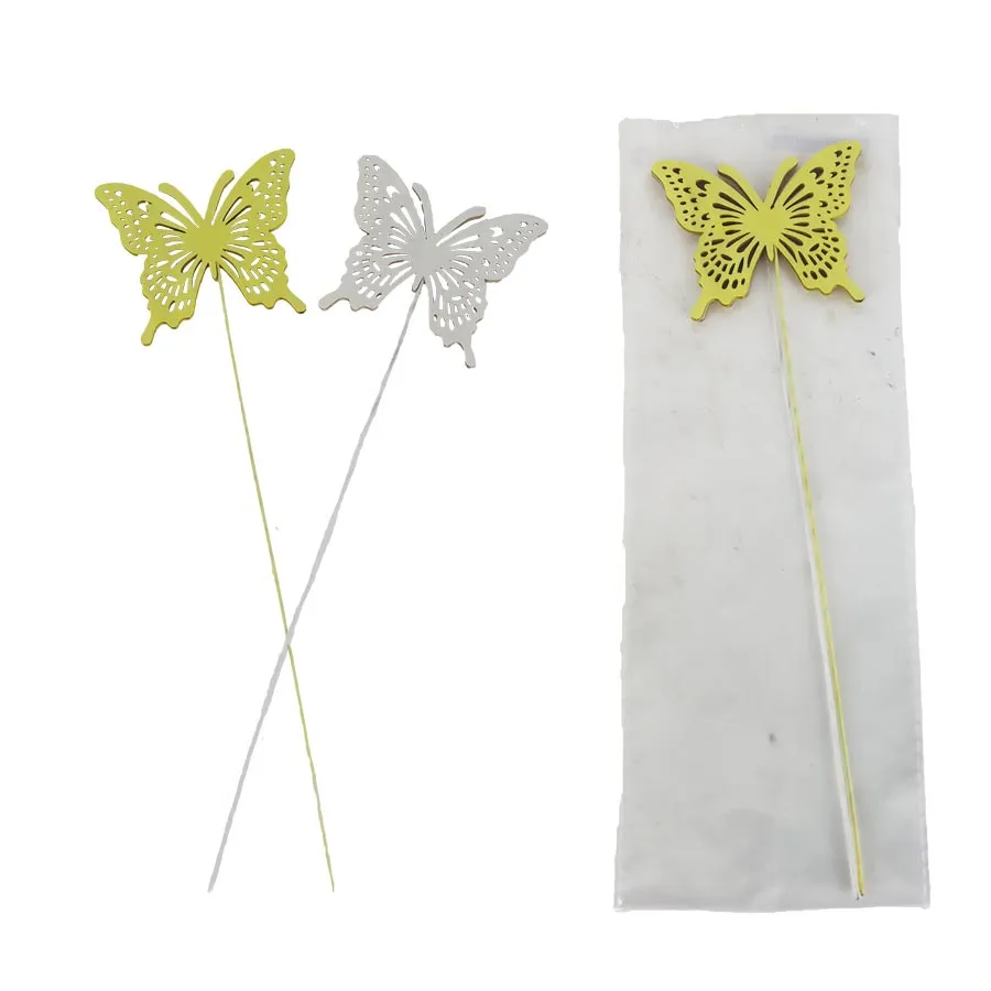 Sada zápichov motýľ. Súprava obsahuje 2 zápichy. Zápich má rozmery: 8 x 6,6 cm, hrúbku 0,2 cm, celková dĺžka zápichu 27 cm.
