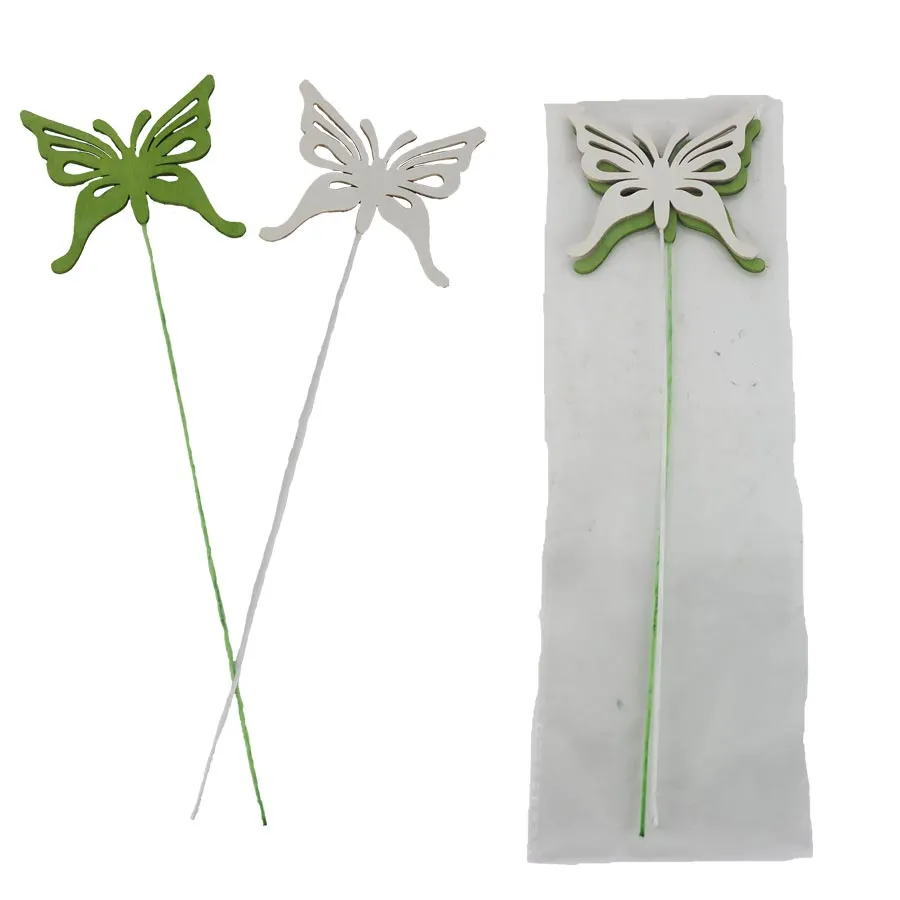 Sada zápichov motýľ. Súprava obsahuje 2 zápichy. Zápich má rozmery: 8 x 6,6 cm, hrúbku 0,2 cm, celková dĺžka zápichu 27 cm.