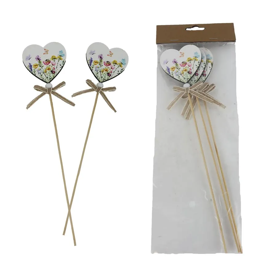 Sada dekoračných zápichov srdca. Súprava obsahuje 3 zápichy. Zápich má rozmery: 6 x 0,5 cm, výšku 5,6 cm, celková dĺžka zápichu 29 cm.